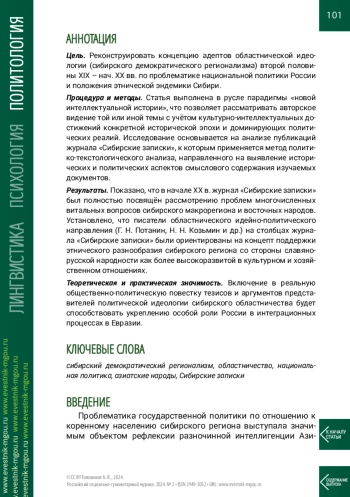 Результаты. Показано, что в начале XX в. журнал «Сибирские записки» был полностью посвящён рассмотрению проблем многочисленных витальных вопросов сибирского макрорегиона и восточных народов. Установлено, что писатели областнического идейно-политического направления (Г. Н. Потанин, Н. Н. Козьмин и др.) на столбцах журнала «Сибирские записки» были ориентированы на концепт поддержки этнического разнообразия сибирского региона со стороны славяно-русской народности как более высокоразвитой в культурном и хозяйственном отношениях.