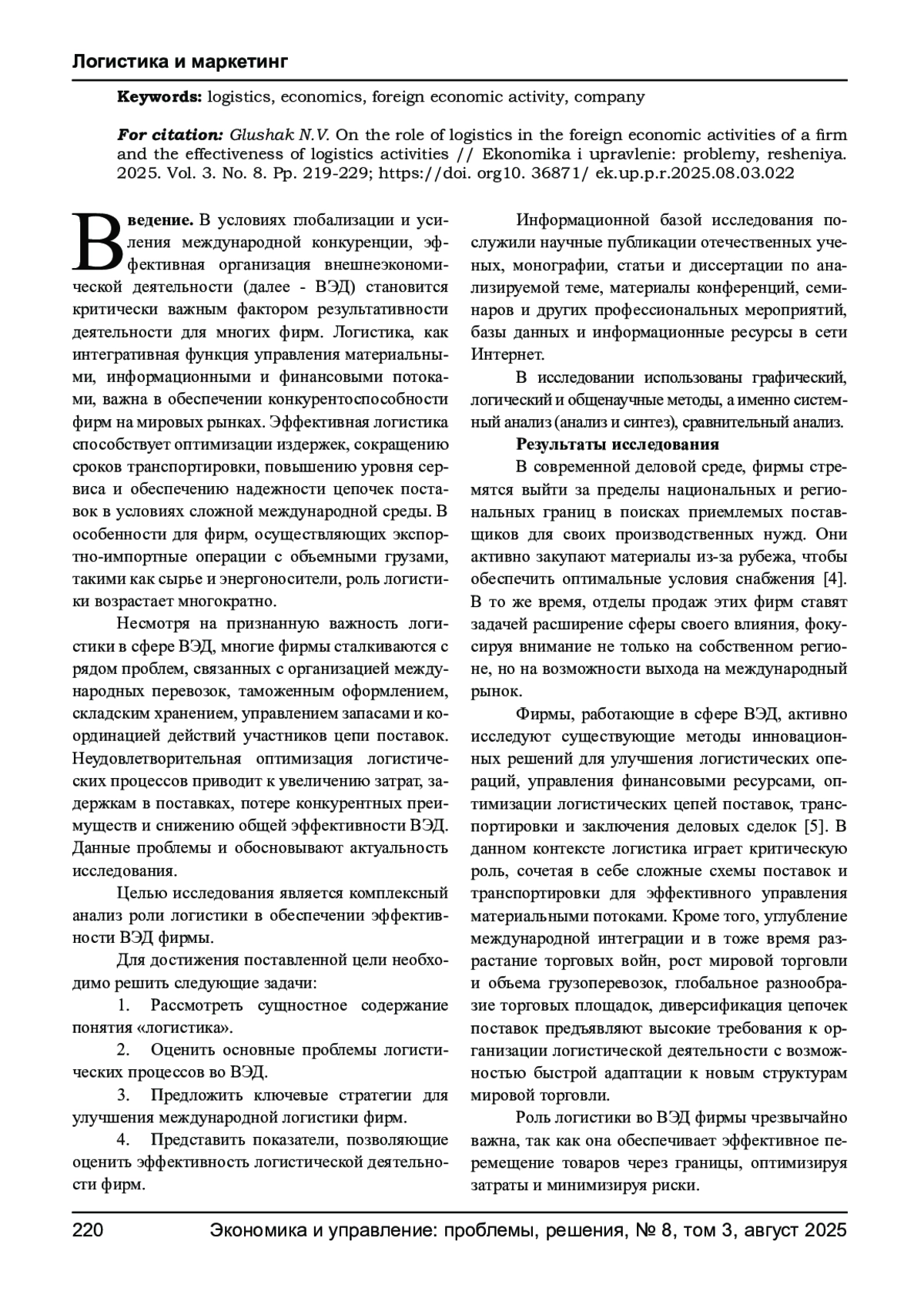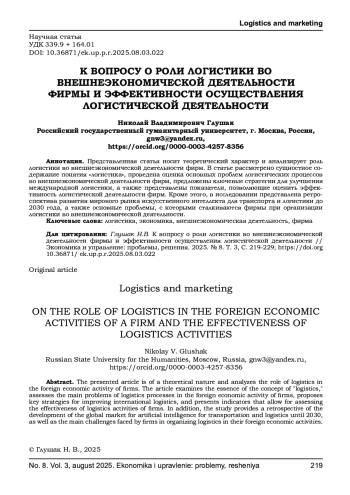 Представленная статья носит теоретический характер и анализирует роль логистики во внешнеэкономической деятельности фирм. В статье рассмотрено сущностное содержание понятия «логистика», проведена оценка основных проблем логистических процессов во внешнеэкономической деятельности фирм, предложены ключевые стратегии для улучшения международной логистики, а также представлены показатели, позволяющие оценить эффективность логистической деятельности фирм. Кроме этого, в исследовании представлена ретроспектива развития мирового рынка искусственного интеллекта для транспорта и логистики до 2030 года, а также основные проблемы, с которыми сталкиваются фирмы при организации логистики во внешнеэкономической деятельности.