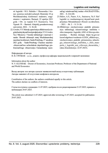 23. Шилов, А.С., Панов, С.А., Смирнова, Ю.В. Роль логистики во внешнеторговой деятельности предприятия //Менеджмент в России и за рубежом. - 2021. - №. 2. - С. 21-26. EDN: UVSDKX