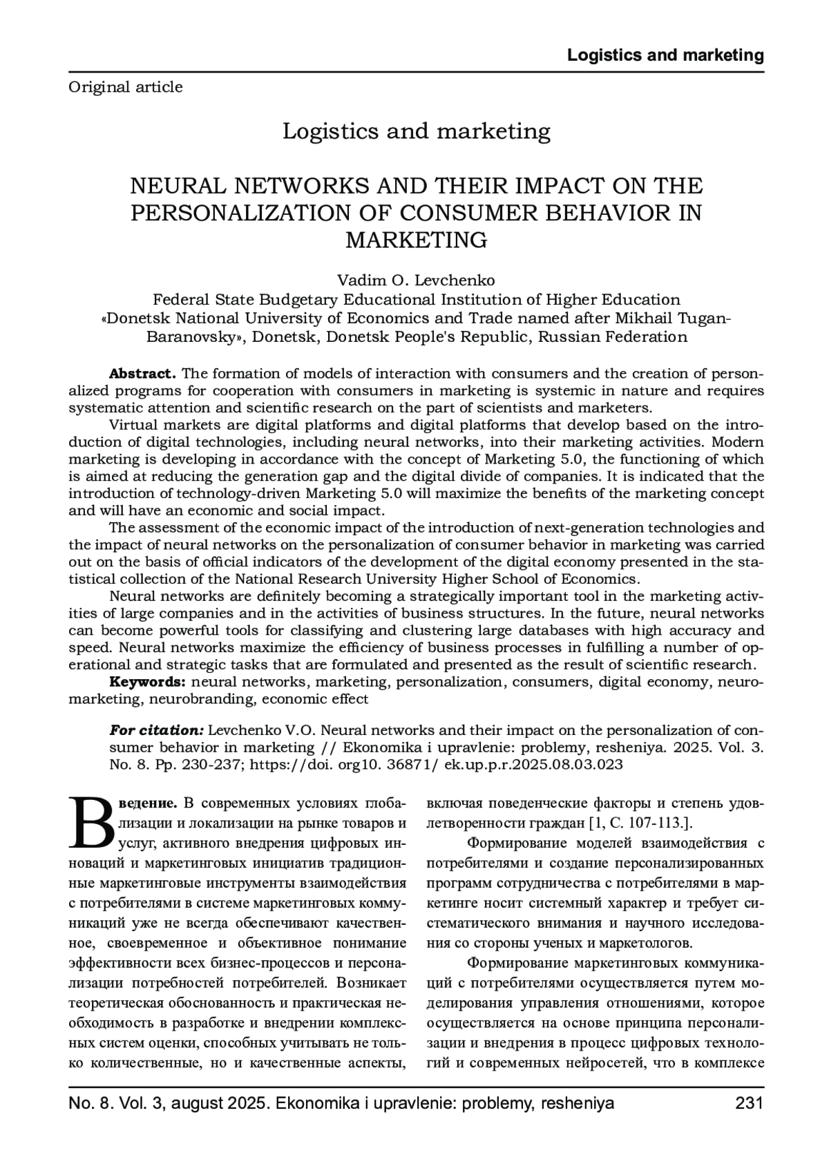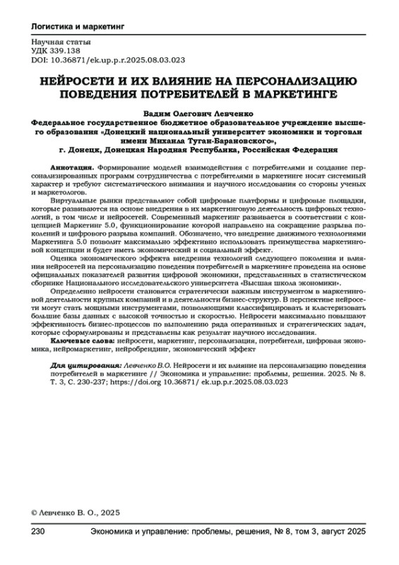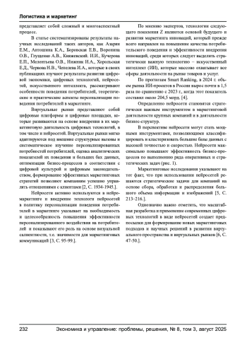 Формирование моделей взаимодействия с потребителями и создание персонализированных программ сотрудничества с потребителями в маркетинге носят системный характер и требуют систематического внимания и научного исследования со стороны ученых и маркетологов. Виртуальные рынки представляют собой цифровые платформы и цифровые площадки, которые развиваются на основе внедрения в их маркетинговую деятельность цифровых технологий, в том числе и нейросетей. Современный маркетинг развивается в соответствии с концепцией Маркетинг 5.0, функционирование которой направлено на сокращение разрыва поколений и цифрового разрыва компаний. Обозначено, что внедрение движимого технологиями Маркетинга 5.0 позволит максимально эффективно использовать преимущества маркетинговой концепции и будет иметь экономический и социальный эффект. Оценка экономического эффекта внедрения технологий следующего поколения и влияния нейросетей на персонализацию поведения потребителей в маркетинге проведена на основе официальных показателей развития цифровой экономики, представленных в статистическом сборнике Национального исследовательского университета «Высшая школа экономики». Определенно нейросети становятся стратегически важным инструментом в маркетинговой деятельности крупных компаний и в деятельности бизнес-структур. В перспективе нейросети могут стать мощными инструментами, позволяющими классифицировать и кластеризовать большие базы данных с высокой точностью и скоростью. Нейросети максимально повышают эффективность бизнес-процессов по выполнению ряда оперативных и стратегических задач, которые сформулированы и представлены как результат научного исследования.