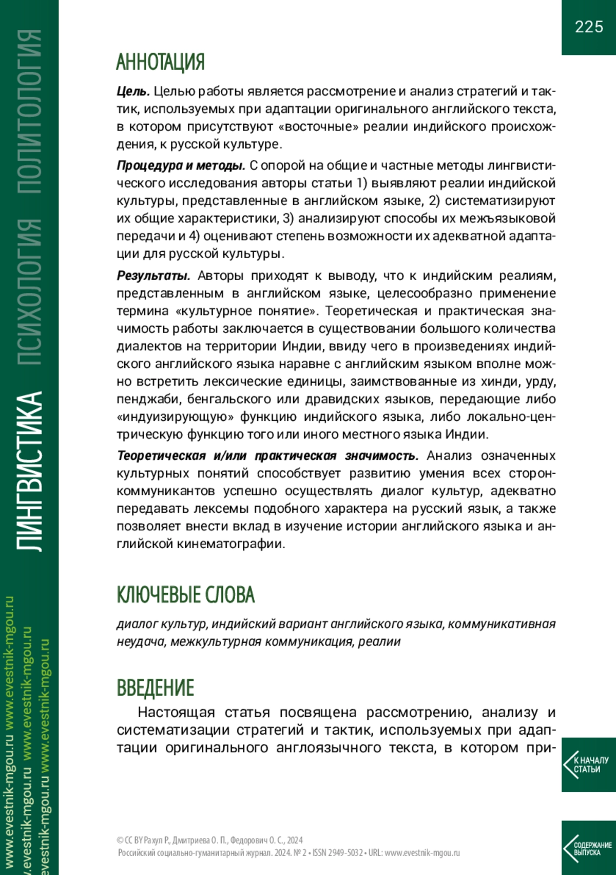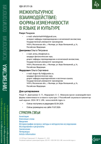 Процедура и методы. С опорой на общие и частные методы лингвистического исследования авторы статьи 1) выявляют реалии индийской культуры, представленные в английском языке, 2) систематизируют их общие характеристики, 3) анализируют способы их межъязыковой передачи и 4) оценивают степень возможности их адекватной адаптации для русской культуры.