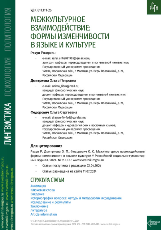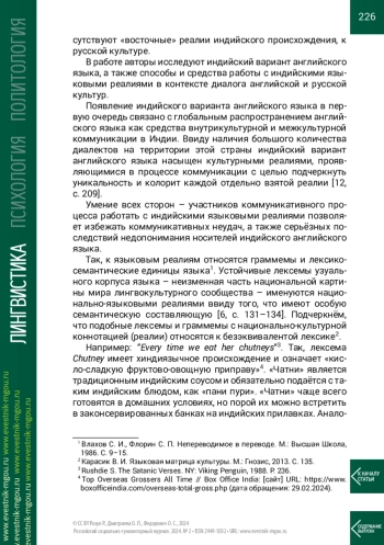 1. Дмитриева О. П. Способы выражения национальных индийских реалий в английском языке (на материале кинематографа) // Большое евразийское партнёрство: лингвистические, политические и педагогические аспекты: материалы Международной научно-практической конференции, Москва, 15-17 декабря 2022 г. / под ред. Е. Ю. Харитоновой. М.: Московский государственный областной университет, 2018. С. 249-255.