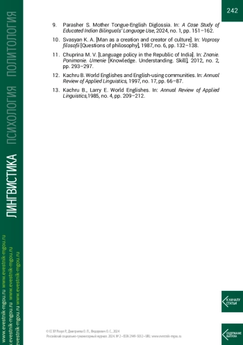 9. Парашер С. Mother Tongue-English Diglossia // A Case Study of Educated Indian Bilinguals’ Language Use. 2024. №1. P. 151-162.