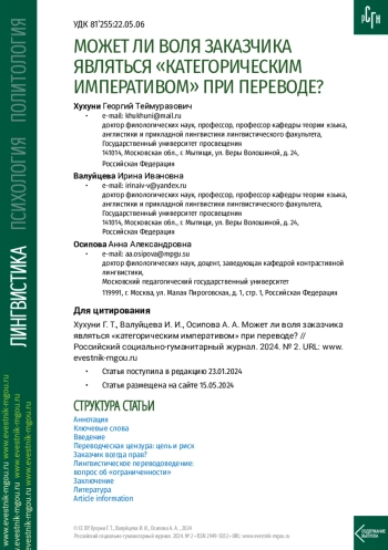 Результаты. Обосновано положение о том, что выдвинутый в ряде концепций современного переводоведения тезис о монополии заказчика при определении содержания и формы переводного текста независимо от оригинала означает фактическую ликвидацию перевода как особой формы межъязыковой и межкультурной коммуникации и не может считаться оправданным ни с собственно лингвистической, ни с лингвокультурной точек зрения.