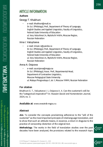 Цель. Рассмотреть концепции, провозглашающие следование «воле заказчика» важнейшим принципом межъязыкового перевода, и показать, что подобная установка означает, по существу, возвращение в замаскированной форме к практике цензурного искажения текста оригинала.
