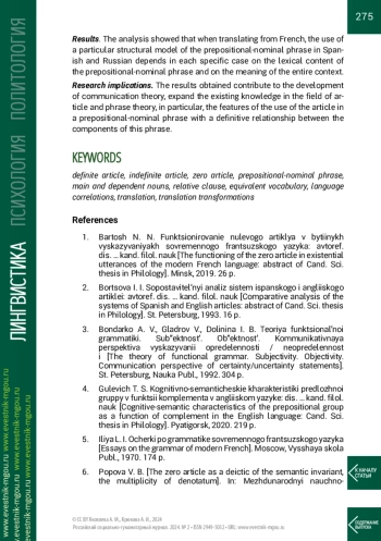 1. Бартош Н. Н. Функционирование нулевого артикля в бытийных высказываниях современного французского языка: автореф. дис. … канд. филол. наук. Минск, 2019. 26 с.
