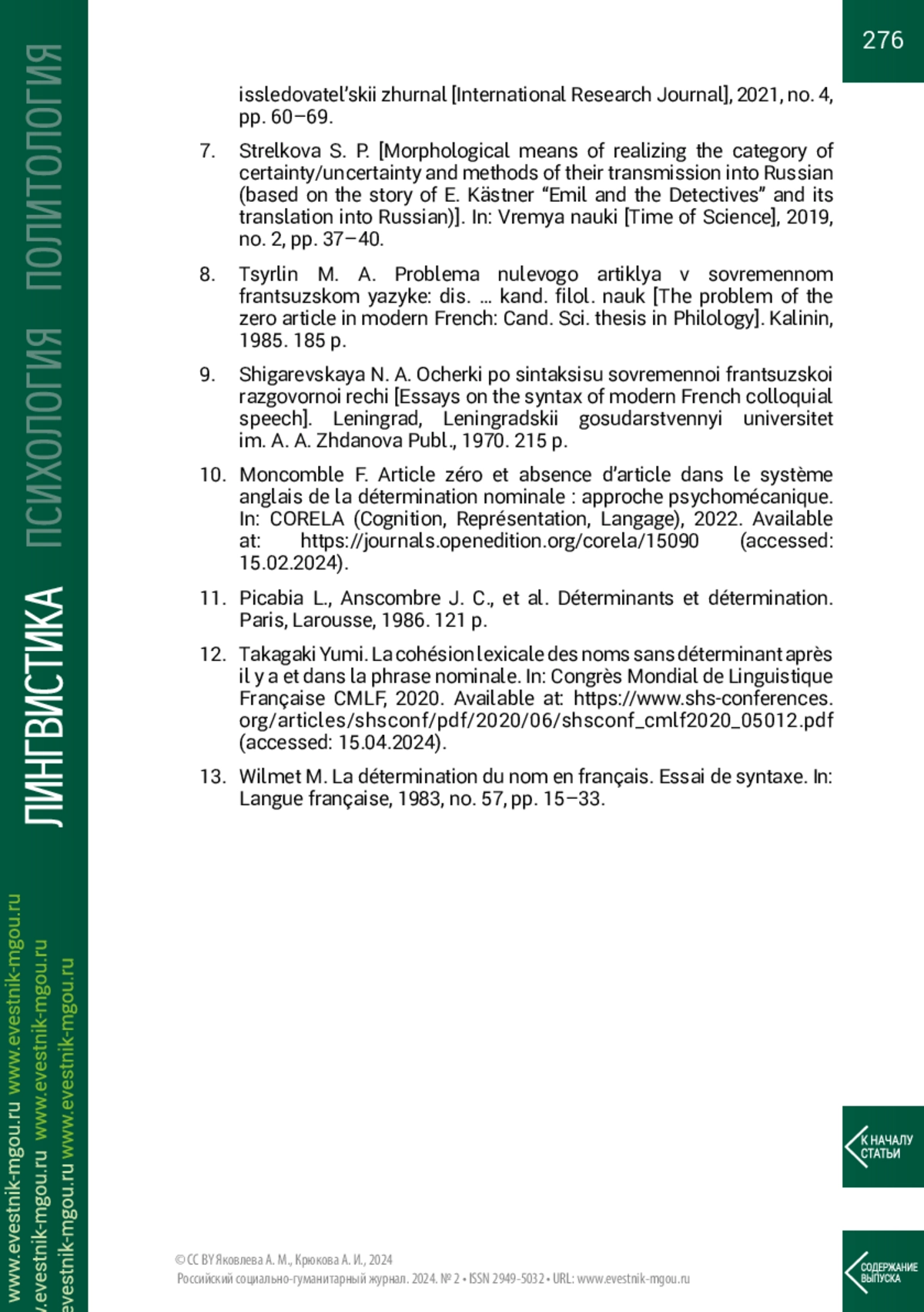 10. Moncomble F. Article zéro et absence d’article dans le système anglais de la détermination nominale : approche psychomécanique [Электронный ресурс] // CORELA (Cognition, Représentation, Langage). [2022]. URL: https://journals.openedition.org/corela/15090 (дата обращения: 15.02.2024).