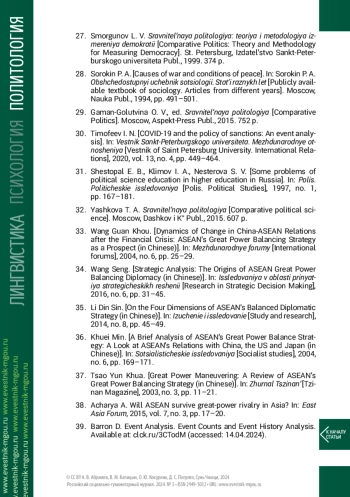 34. Ван Сэнь. Стратегический анализ: истоки дипломатии балансирования великих держав АСЕАН (на кит. яз.) // Исследования в области принятия стратегических решений. 2016. №6. С. 31-45.