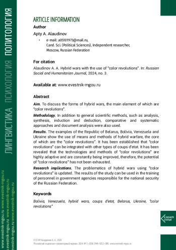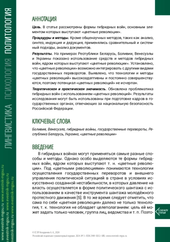 Цель. В статье рассмотрены формы гибридных войн, основным элементом которых выступают «цветные революции».