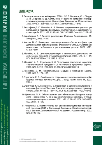 2. Евстафьев Д. Г., Манойло А. В. Генезис современных цветных революций (на примере Венесуэлы и Белоруссии) // Дипломатическая служба. 2021. №1. С. 50-61. https://doi.org/10.33920 / vne -01-2101-06