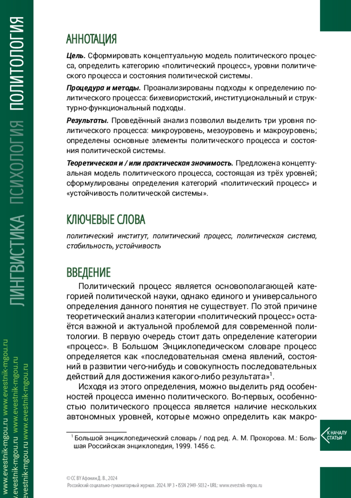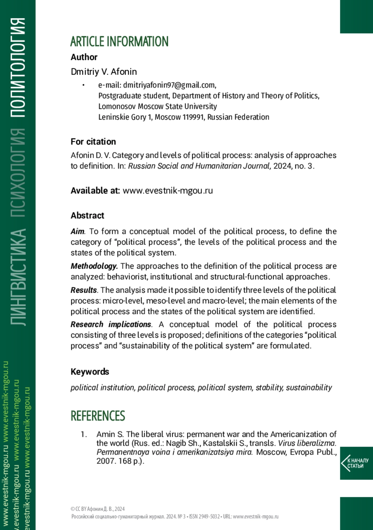 Теоретическая и / или практическая значимость. Предложена концептуальная модель политического процесса, состоящая из трёх уровней; сформулированы определения категорий «политический процесс» и «устойчивость политической системы».