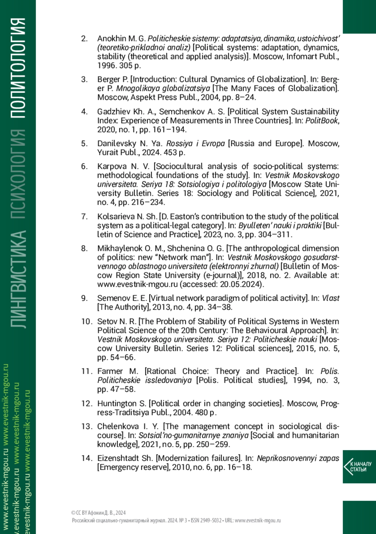 4. Гаджиев Х. А., Семченков А. С. Индекс устойчивости политической системы: опыт измерений в трёх странах // PolitBook. 2020. №1. С. 161-194.
