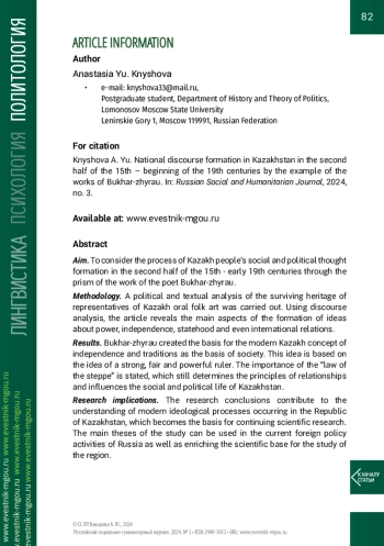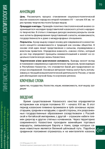 Цель. Рассмотреть процесс становления социально-политической мысли казахского народа во второй половине XV – начале XIX вв. через призму творчества поэта Бухара-жырау.