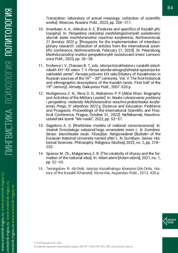 13. Сагатова А. С. Мировоззренческие модели национального сознания // Вестник Евразийского национального университета имени Л. Н. Гумилева. Серия: Исторические науки. Философия. Религиоведение. 2022. №2. С. 218-233.
