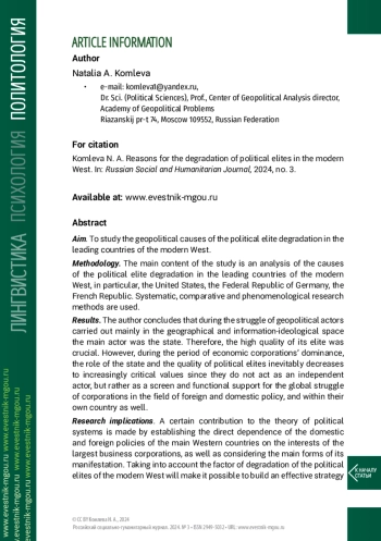 Цель. Изучение геополитических причин процесса деградации политических элит ведущих стран современного Запада.