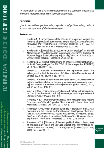 Результаты. На основе проведённого анализа автор приходит к выводу, что в период борьбы геополитических акторов, осуществлявшейся преимущественно в географическом и информационно-идеологическом пространстве, основным действующим лицом являлось государство, и высокое качество его элит имело решающее значение; однако в период доминирования экономических корпораций роль государства и качество политических элит неизбежно снижаются до всё более критических значений, поскольку они выступают не самостоятельным актором, а ширмой и функциональным обеспечением глобальной борьбы корпораций на поле внешней и внутренней политики, причём также внутри собственной страны.
