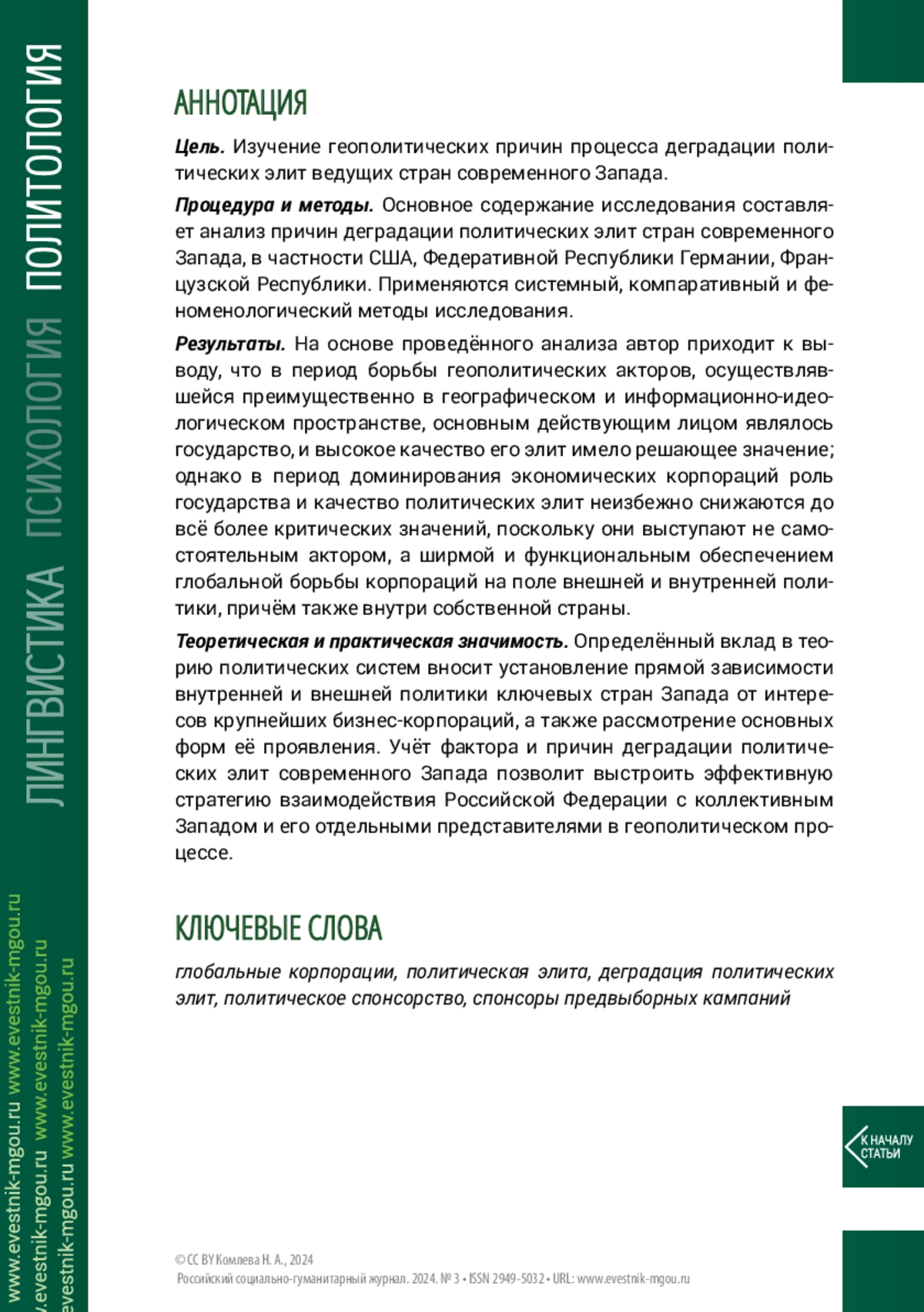 9. Рожковский В. Б. Кризис западных политических элит в контексте современного ценностного и культурно-цивилизационного противостояния России и Запада // Философия права. 2022. №4. С. 42-47.