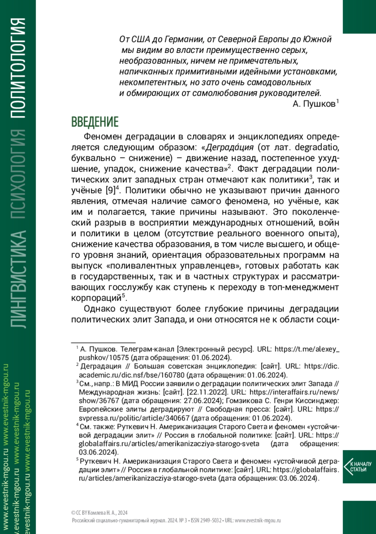 4. Лавров С. В. Подлинная многосторонность и дипломатия против «порядка, основанного на правилах» // Россия в глобальной политике. 2023. Т. 21. №4. С. 72-81.