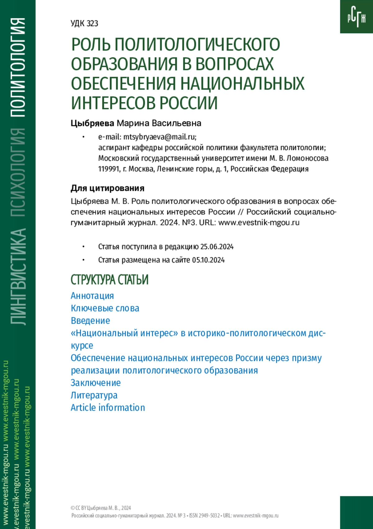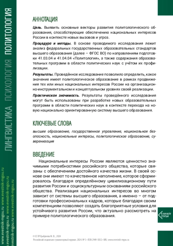 Цель. Выявить основные векторы развития политологического образования, способствующие обеспечению национальных интересов России в контексте новых вызовов и угроз.