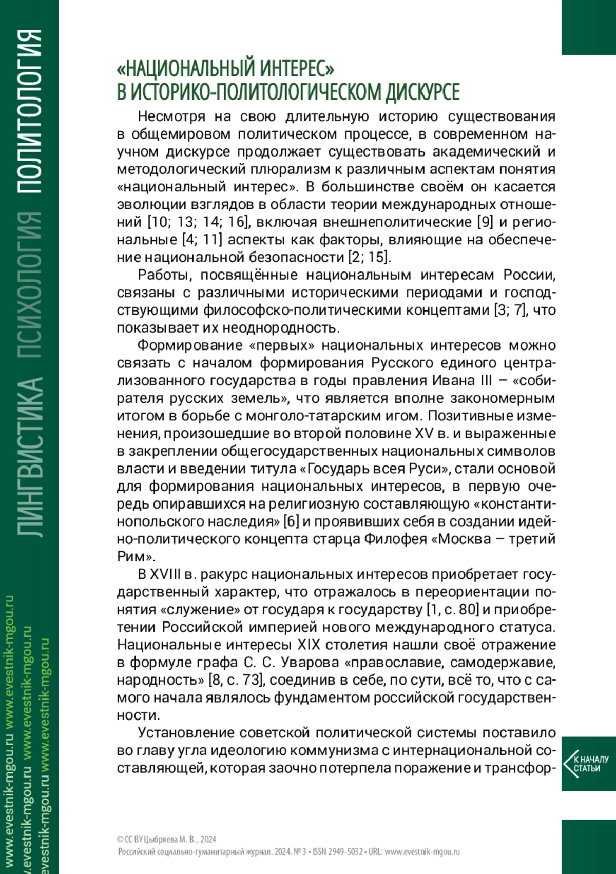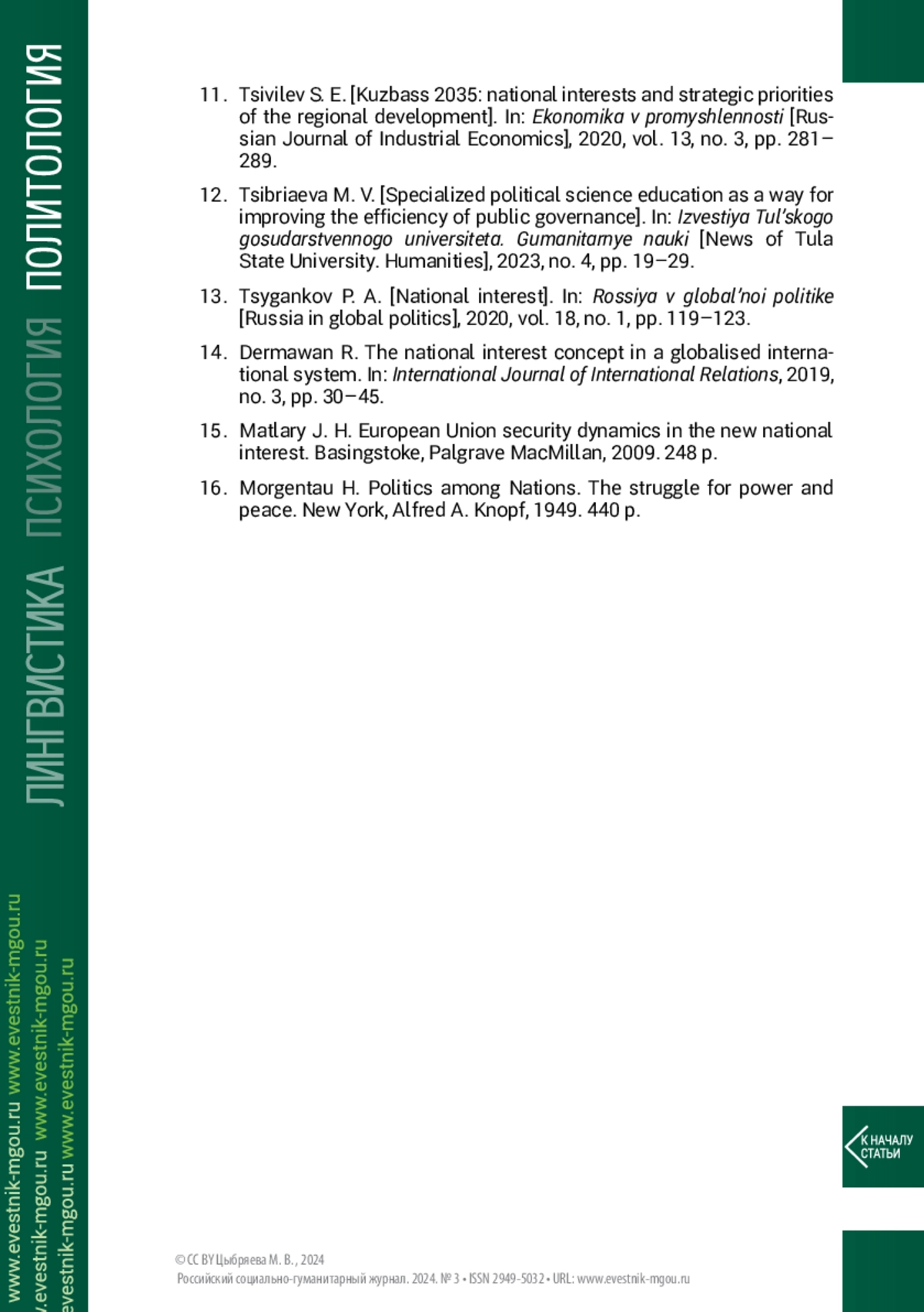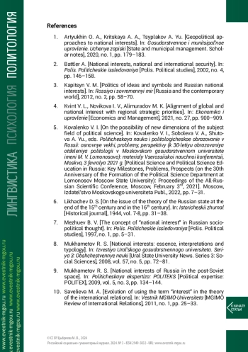 7. Межуев Б. В. Понятие «национальный интерес» в российской общественно-политической мысли // Полис. Политические исследования. 1997. №1. С. 5-31.