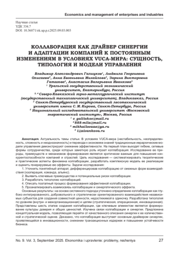 Актуальность темы статьи. В условиях VUCA-мира (нестабильность, неопределенность, сложность и неоднозначность) и перехода к экономике знаний традиционные иерархические модели управления демонстрируют снижение эффективности. На первый план выходят гибкие, сетевые формы сотрудничества, среди которых заметную роль играет коллаборация. Исследование ее природы, преимуществ и механизмов формирования является критически важным для повышения конкурентоспособности компаний и отраслей.