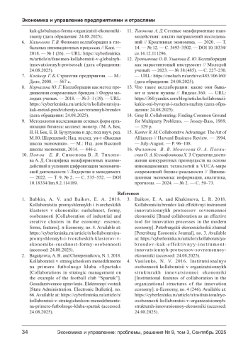 4. Василенко Н. В. Институциональные особенности коллаборации в организационных структурах инновационной экономики // π-E conomy. - 2016. - № 4 (246). - URL: https://cyberleninka.ru/article/n/institutsionalnye-osobennosti-kollaboratsii-v-organizatsionnyh-strukturah-innovatsionnoy-ekonomiki (дата обращения: 24.08.2025).