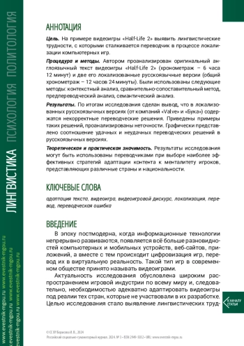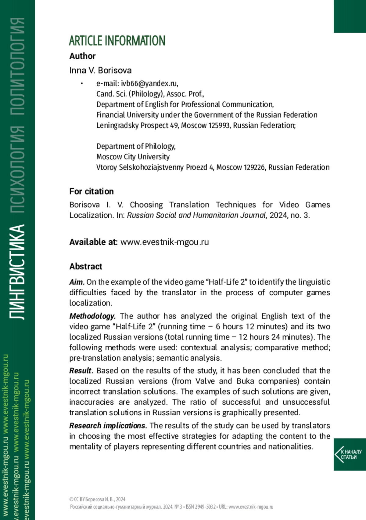 5. Коптелова С. А., Руцкая Е. А. Лингвистические аспекты локализации видеоигр // Вестник Пермского университета. Серия: Российская и зарубежная филология. 2022. Т. 14. №3. С. 16-25.