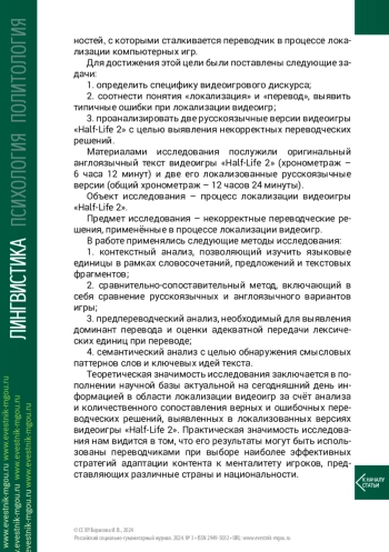 Процедура и методы. Автором проанализирован оригинальный англоязычный текст видеоигры «Half-Life 2» (хронометраж – 6 часа 12 минут) и две его локализованные русскоязычные версии (общий хронометраж – 12 часов 24 минуты). Были использованы следующие методы: контекстный анализ, сравнительно-сопоставительный метод, предпереводческий анализ, семантический анализ.