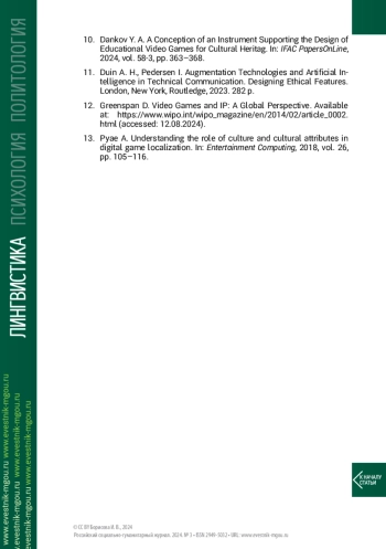 13. Pyae A. Understanding the role of culture and cultural attributes in digital game localization // Entertainment Computing. 2018. Vol. 26. P. 105-116.