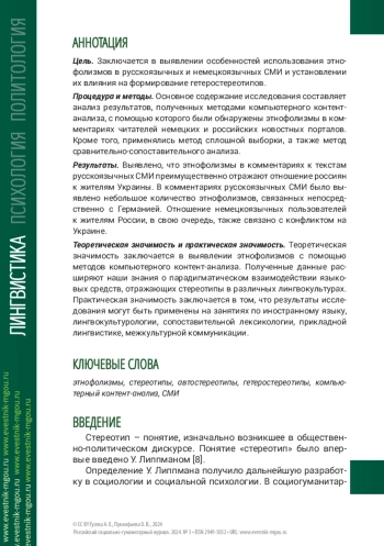 Цель. Заключается в выявлении особенностей использования этнофолизмов в русскоязычных и немецкоязычных СМИ и установлении их влияния на формирование гетеростереотипов.