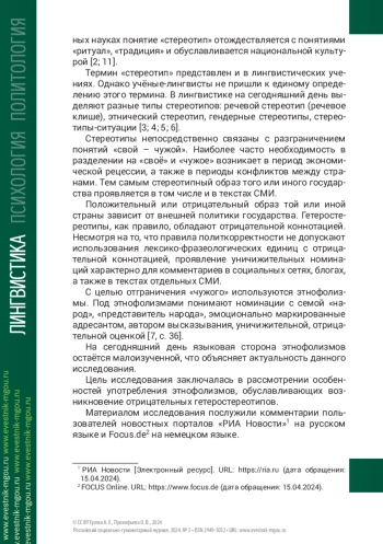 6. Жуковская Н. В., Нужнова Е. Е. Языковые средства отражения этнических стереотипов в современных СМИ // Вестник Пермского национального исследовательского политехнического университета. Проблемы языкознания и педагогики. 2020. №1. C. 74-81.