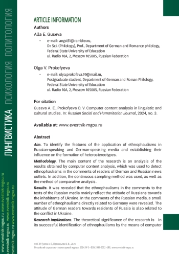 Процедура и методы. Основное содержание исследования составляет анализ результатов, полученных методами компьютерного контент-анализа, с помощью которого были обнаружены этнофолизмы в комментариях читателей немецких и российских новостных порталов. Кроме того, применялись метод сплошной выборки, а также метод сравнительно-сопоставительного анализа.