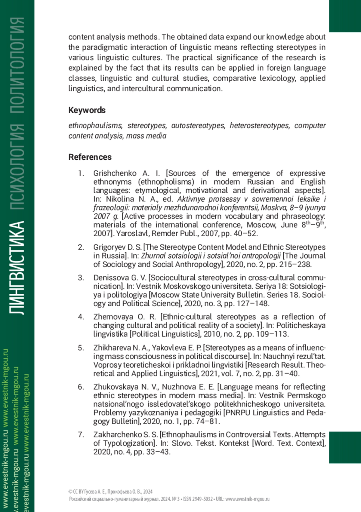 3. Денисова Г. В. Социокультурные стереотипы в межкультурной коммуникации // Вестник Московского университета. Серия 18: Социология и политология. 2020. №3. С. 127-148.