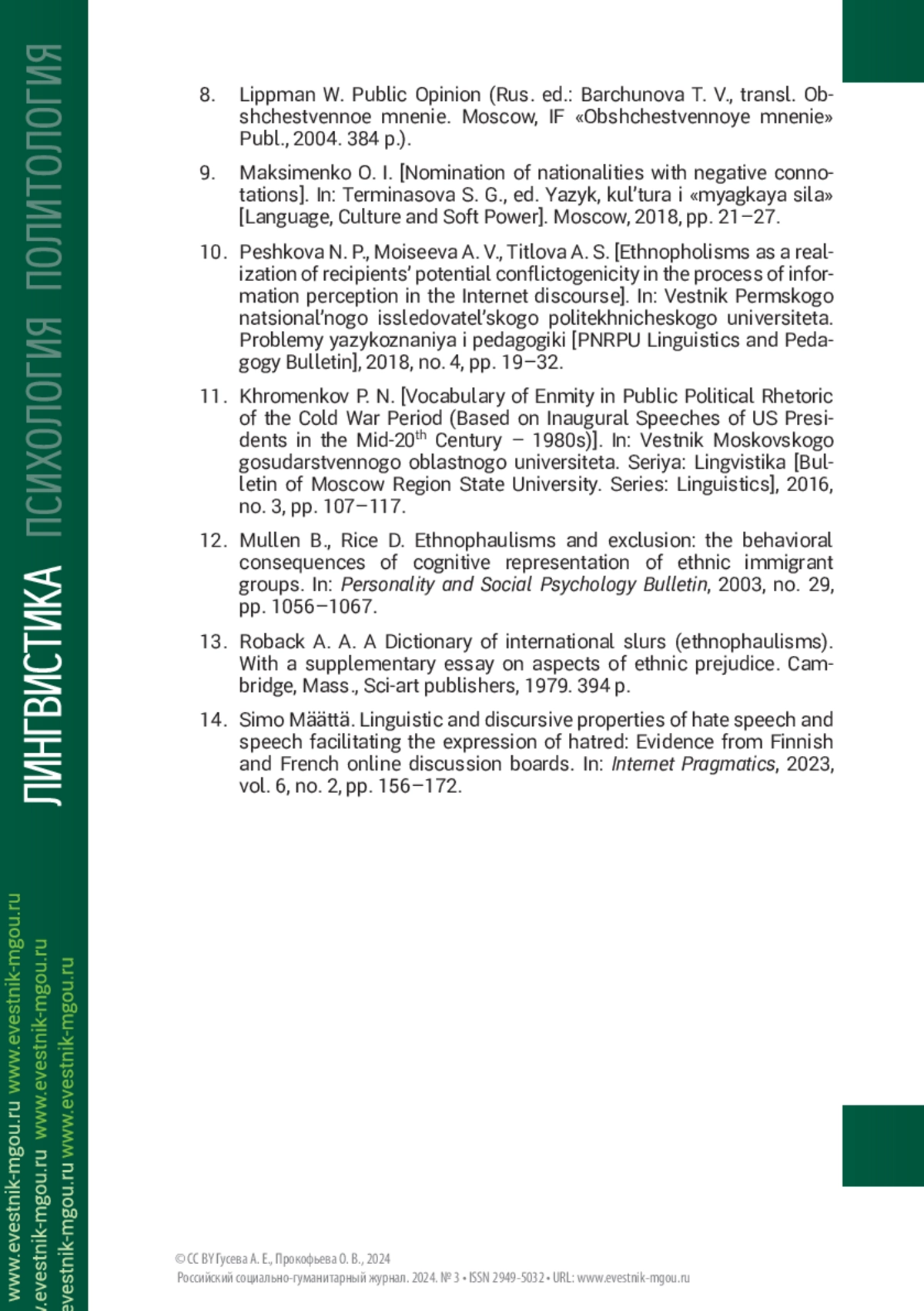 14. Simo Määttä. Linguistic and discursive properties of hate speech and speech facilitating the expression of hatred: Evidence from Finnish and French online discussion boards // Internet Pragmatics. 2023. Vol. 6. No. 2. P. 156-172.