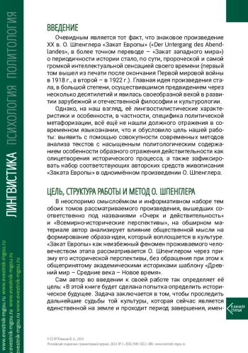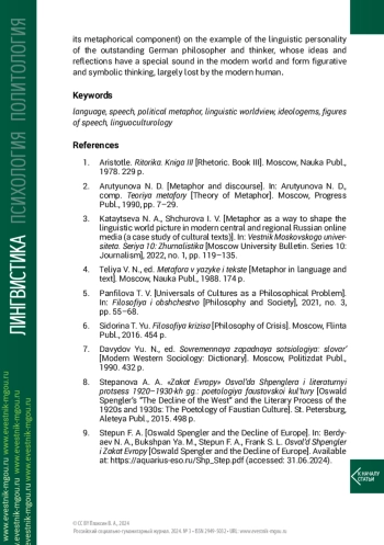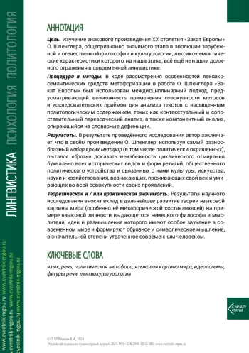 Цель. Изучение знакового произведения XX столетия «Закат Европы» О. Шпенглера, общепризнанно значимого этапа в эволюции зарубежной и отечественной философии и культурологии, лексико-семантические характеристики которого, на наш взгляд, всё ещё не нашли должного отражения в современной лингвистике.