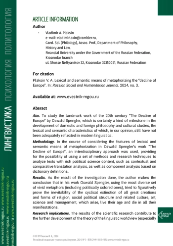Процедура и методы. В ходе рассмотрения особенностей лексико-семантических средств метафоризации в работе О. Шпенглера «Закат Европы» был использован междисциплинарный подход, предусматривающий возможность применения совокупности методов и исследовательских приёмов для анализа текстов с насыщенным политологическим содержанием, таких как контекстуальный и сопоставительный переводческий анализ, а также компонентный анализ, опирающийся на словарные дефиниции.