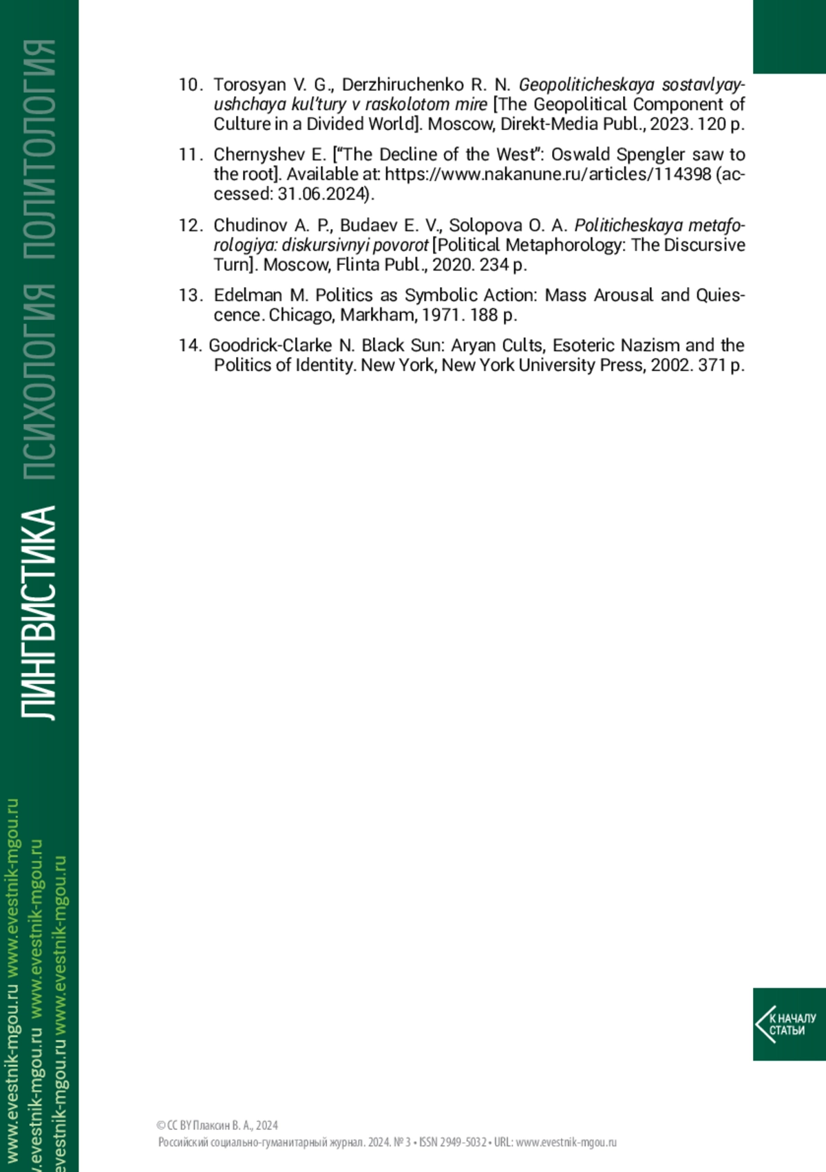 10. Торосян В. Г., Держирученко Р. Н. Геополитическая составляющая культуры в расколотом мире. М.: Директ-Медиа, 2023. 120 с.