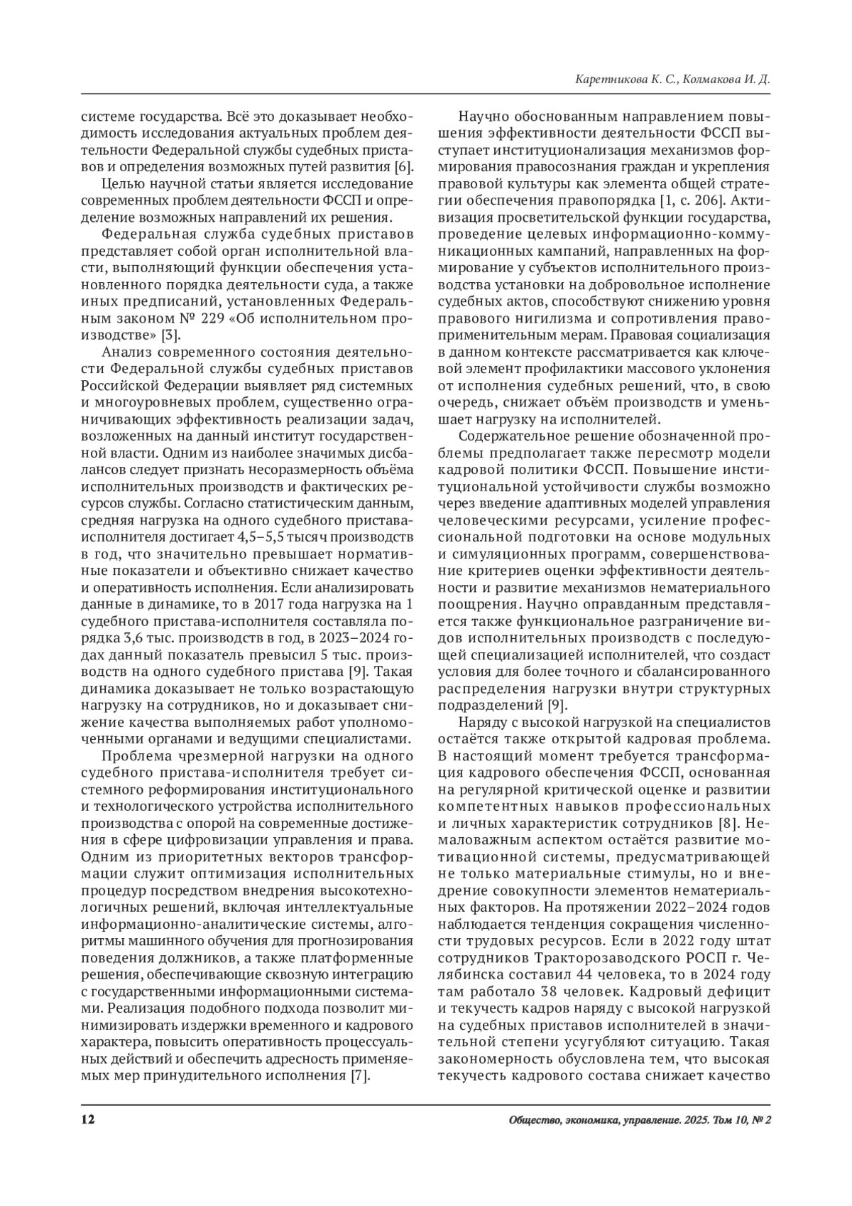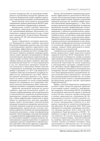 Анализ современного состояния деятельности Федеральной службы судебных приставов Российской Федерации выявляет ряд системных и многоуровневых проблем, существенно ограничивающих эффективность реализации задач, возложенных на данный институт государственной власти. Одним из наиболее значимых дисбалансов следует признать несоразмерность объёма исполнительных производств и фактических ресурсов службы. Согласно статистическим данным, средняя нагрузка на одного судебного приставаисполнителя достигает 4,5–5,5 тысяч производств в год, что значительно превышает нормативные показатели и объективно снижает качество и оперативность исполнения. Если анализировать данные в динамике, то в 2017 года нагрузка на 1 судебного пристава-исполнителя составляла порядка 3,6 тыс. производств в год, в 2023–2024 годах данный показатель превысил 5 тыс. производств на одного судебного пристава [9].