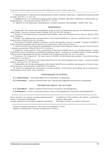 6. Клёпка К. Е. Актуальные аспекты организации деятельности Федеральной службы судебных приставов // Сборник научных трудов победителей и призёров конкурсов на лучшую научную работу: сб. науч. статей. Новокузнецк, 2023. С. 64-67. EDN: BNXWDT