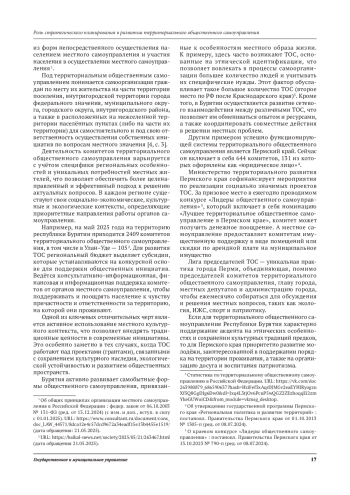 Под территориальным общественным самоуправлением понимается самоорганизация граждан по месту их жительства на части территории поселения, внутригородской территории города федерального значения, муниципального округа, городского округа, внутригородского района, а также в расположенных на межселенной территории населённых пунктах (либо на части их территории) для самостоятельного и под свою ответственность осуществления собственных инициатив по вопросам местного значения [4, с. 3]. Деятельность комитетов территориального общественного самоуправления варьируется с учётом специфики региональных особенностей и уникальных потребностей местных жителей, что позволяет обеспечить более целенаправленный и эффективный подход к решению актуальных вопросов. В каждом регионе существуют свои социально-экономические, культурные и экологические контексты, определяющие приоритетные направления работы органов самоуправления.