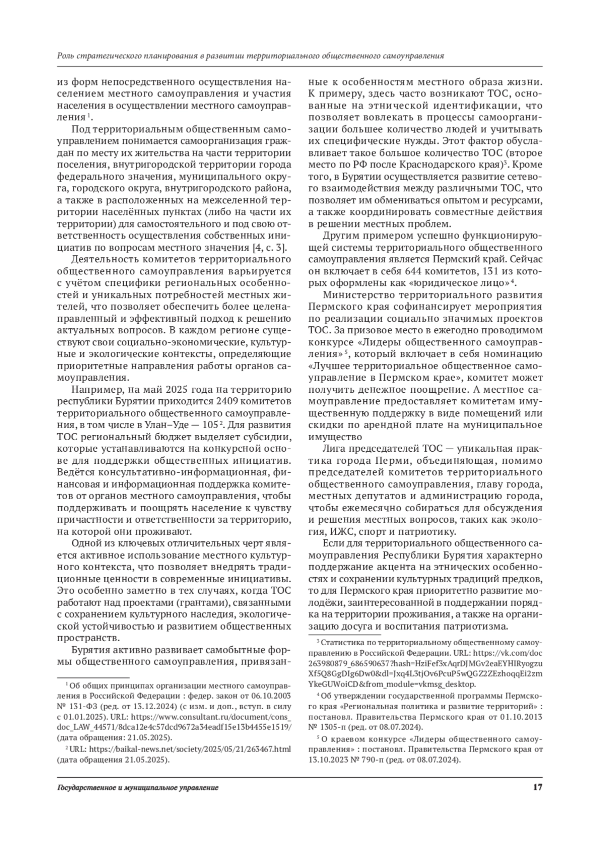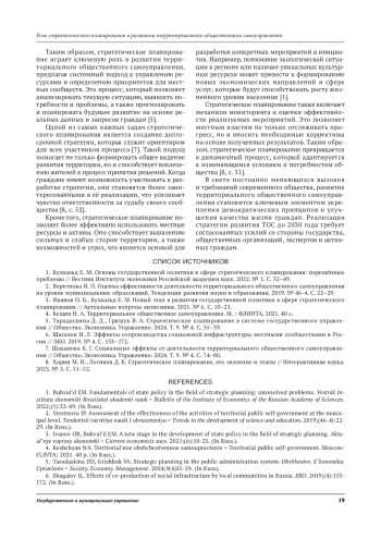 Стратегическое планирование представляет собой важный инструмент для развития территориального общественного самоуправления, обеспечивая основу для устойчивого и гармоничного роста местных сообществ. В статье подтверждена гипотеза, основанная на том, что эффективное планирование способствует реализации инициатив, отражающих реальные потребности граждан, и позволяет строить более ответственные и прозрачные механизмы управления.