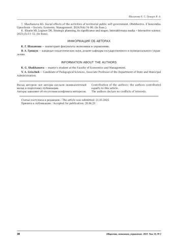 2. Веретнова И. П. Оценка эффективности деятельности территориального общественного самоуправления на уровне муниципальных образований. Тенденции развития науки и образования. 2019. № 46-4. С. 22-29. EDN: THUCLD