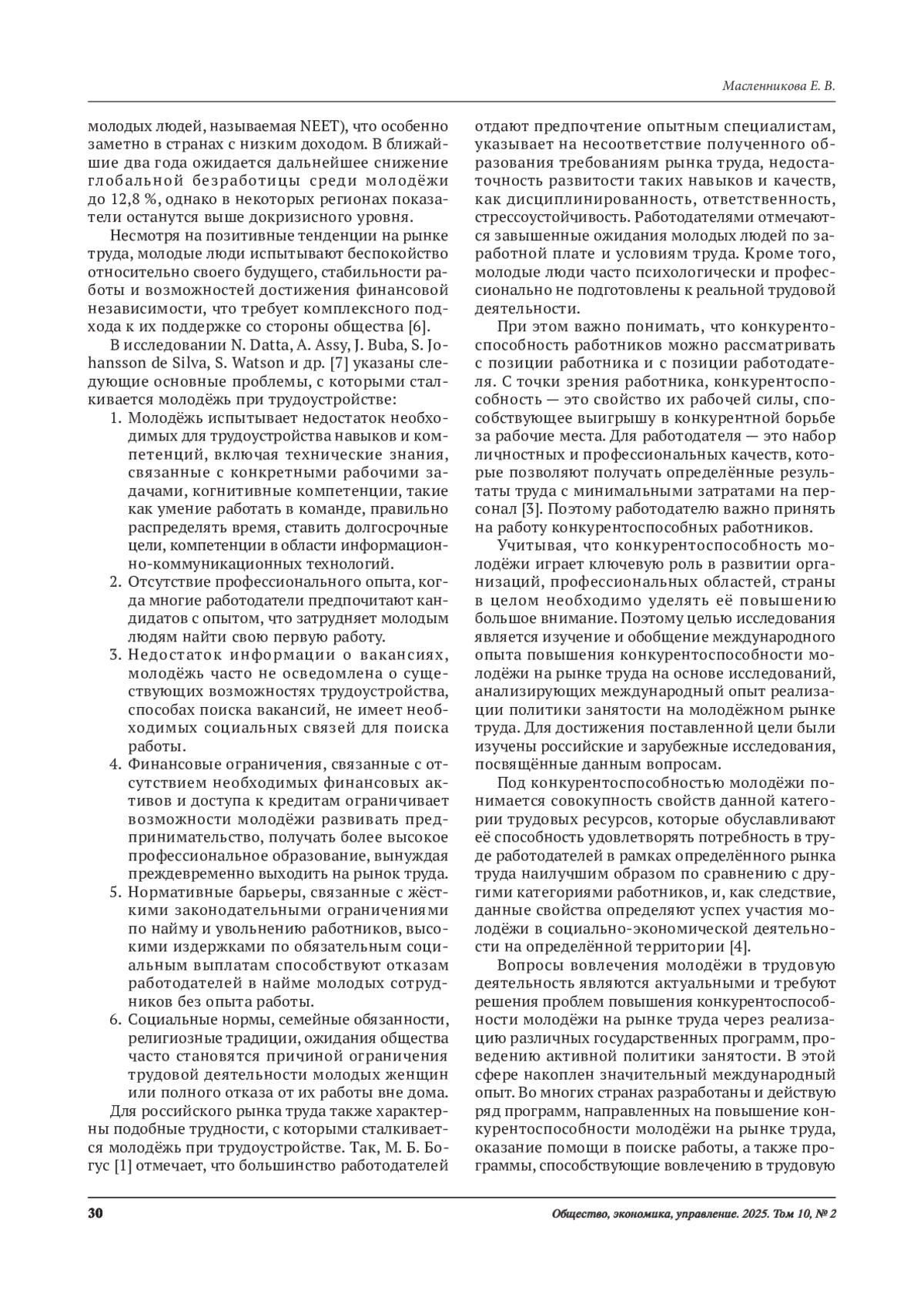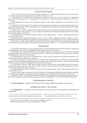 1. Богус М. Б. Конкурентоспособность молодых специалистов: современные вызовы и перспективы развития // Ярославский педагогический вестник. 2023. № 3 (132). С. 28-35. EDN: ZXHXLG