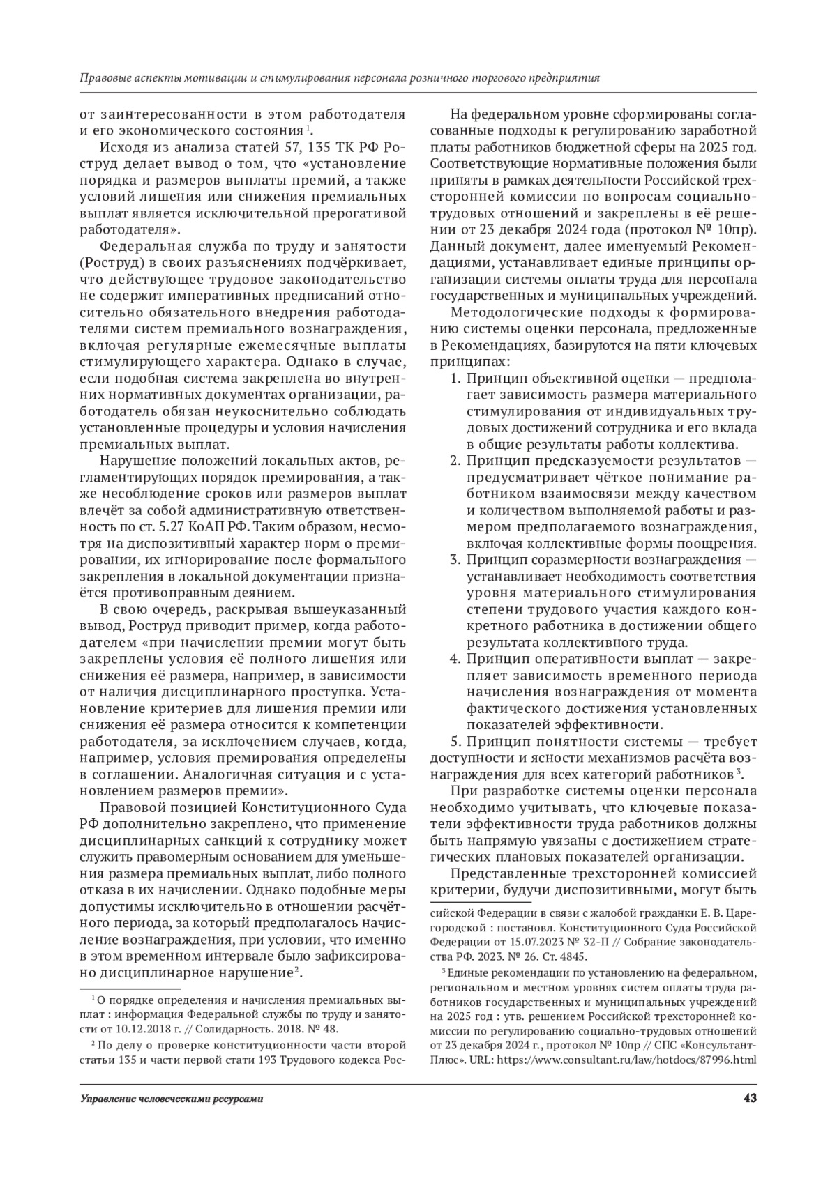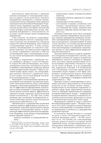 В статье рассмотрены правовые аспекты мотивации и стимулирования персонала розничного торгового предприятия, а также взаимосвязь между системой мотивации и стимулирования персонала и эффективностью деятельности розничного торгового предприятия как коммерческой организации, ключевым показателем которой, в силу гражданского законодательства, является получение прибыли. Специфика мотивации и стимулирования персонала раскрывается через необходимость соблюдения отраслевых норм трудового законодательства, в рамках которого определяются системы мотивации и стимулирования персонала, отражающиеся в локальных нормативных актах предприятий, а также через необходимость использования межотраслевого и междисциплинарного подходов в ходе достижения коммерческих целей.