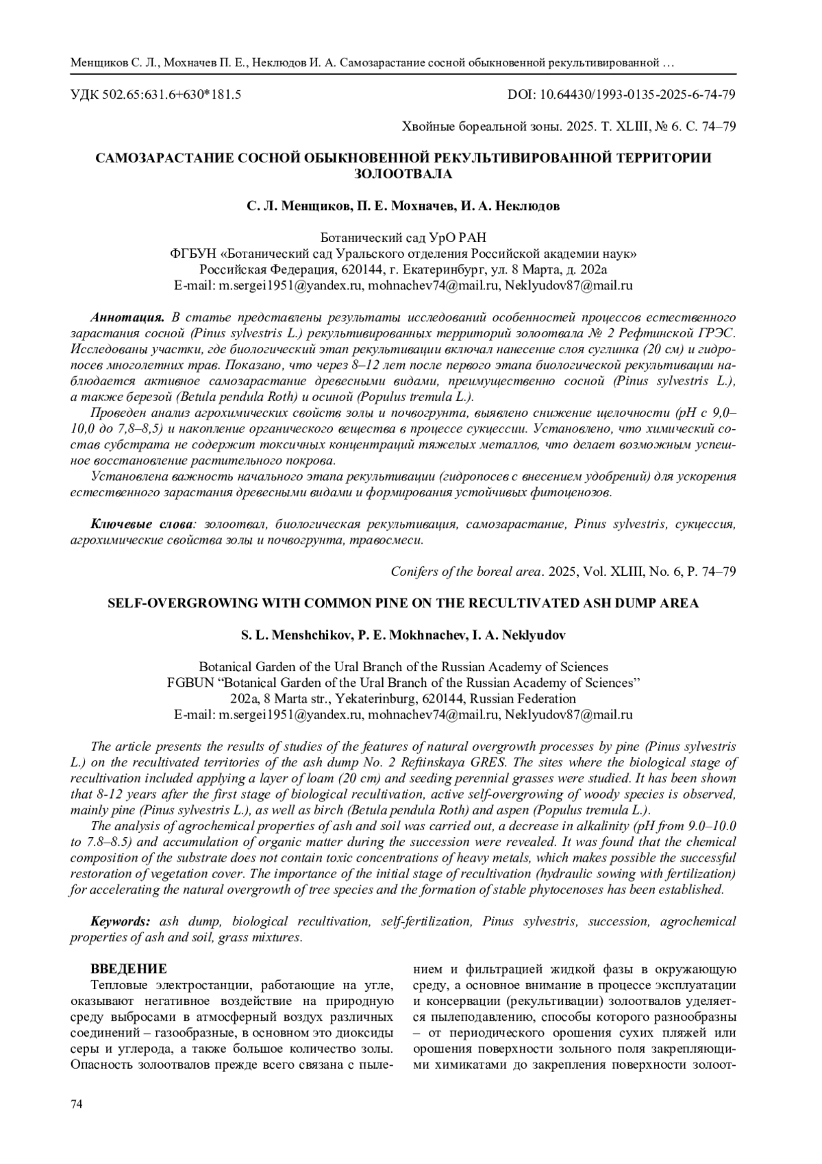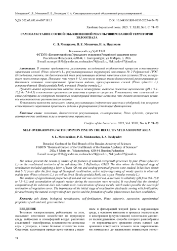В статье представлены результаты исследований особенностей процессов естественного зарастания сосной (Pinus sylvestris L.) рекультивированных территорий золоотвала № 2 Рефтинской ГРЭС. Исследованы участки, где биологический этап рекультивации включал нанесение слоя суглинка (20 см) и гидропосев многолетних трав. Показано, что через 8–12 лет после первого этапа биологической рекультивации наблюдается активное самозарастание древесными видами, преимущественно сосной (Pinus sylvestris L.), а также березой (Betula pendula Roth) и осиной (Populus tremula L.).