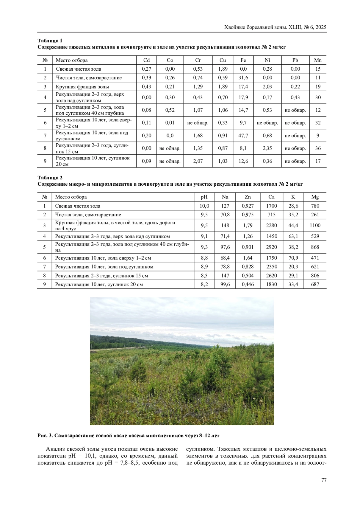 Проведен анализ агрохимических свойств золы и почвогрунта, выявлено снижение щелочности (pH с 9,0– 10,0 до 7,8–8,5) и накопление органического вещества в процессе сукцессии. Установлено, что химический состав субстрата не содержит токсичных концентраций тяжелых металлов, что делает возможным успешное восстановление растительного покрова.