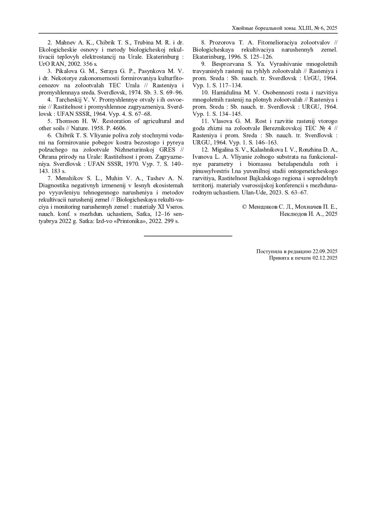 2. Махнев А. К., Чибрик Т. С., Трубина М. Р. и др. Экологические основы и методы биологической рекультивации тепловых электростанций на Урале. Екатеринбург: УрО РАН, 2002. 356 с.