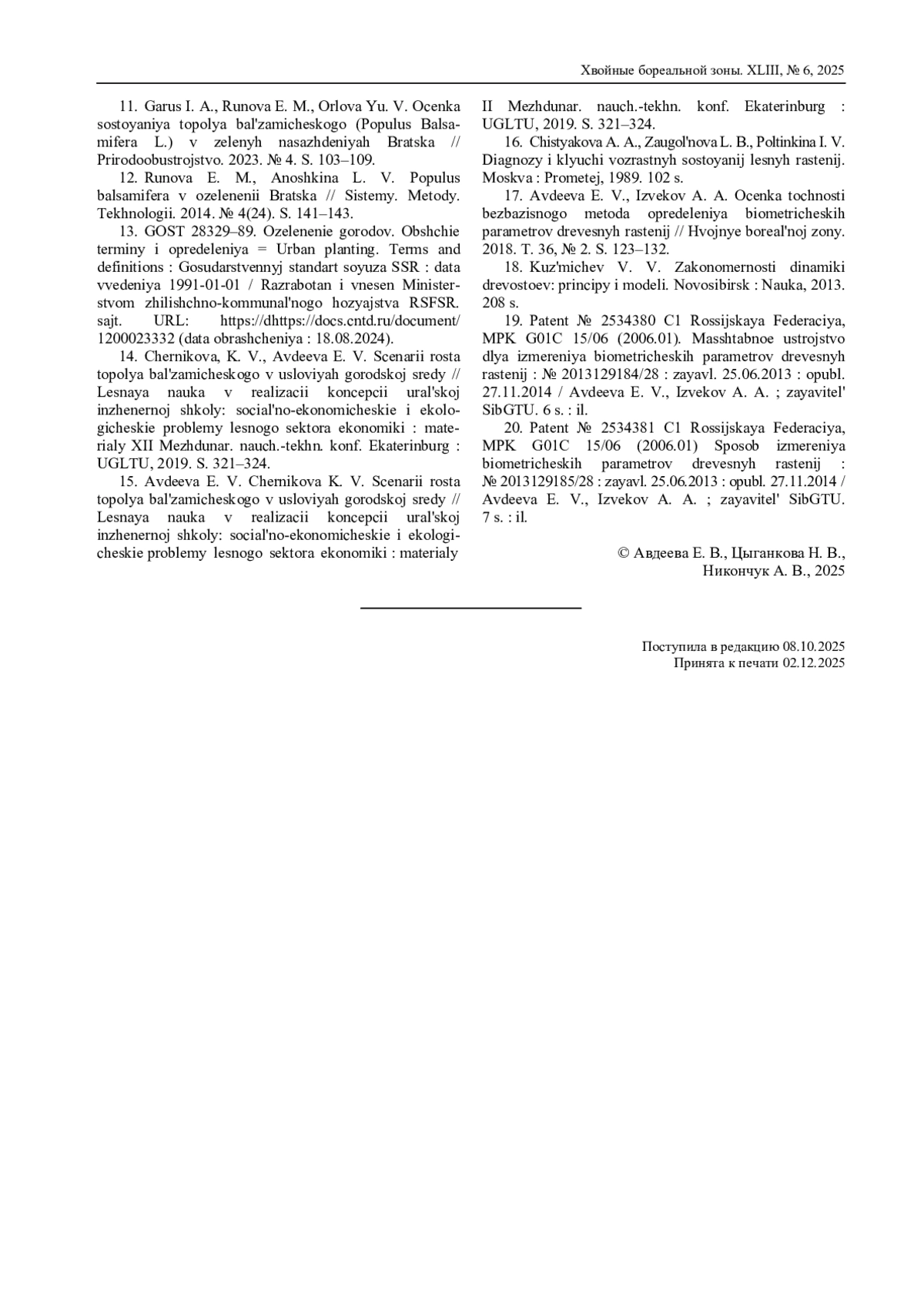 17. Авдеева Е. В., Извеков А. А. Оценка точности безбазисного метода определения биометрических параметров древесных растений // Хвойные бореальной зоны. 2018. Т. 36, № 2. С. 123-132.