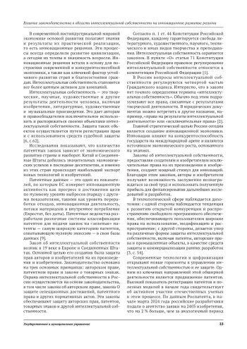 В России вопросы интеллектуальной собственности регулируются четвертой частью Гражданского кодекса. Интересно, что в законе нет точного определения термина «интеллектуальная собственность». Обычно под этим подразумевают все права, связанные с результатами творческой деятельности. В юридических документах можно встретить и другие названия, например, «права на результаты интеллектуальной деятельности» или «исключительные права» [2]. Главной стратегической целью России сегодня является создание инновационной экономики. Инновации влияют на конкурентоспособность государств на международной арене и являются источником экономического роста, основанного на знаниях.
