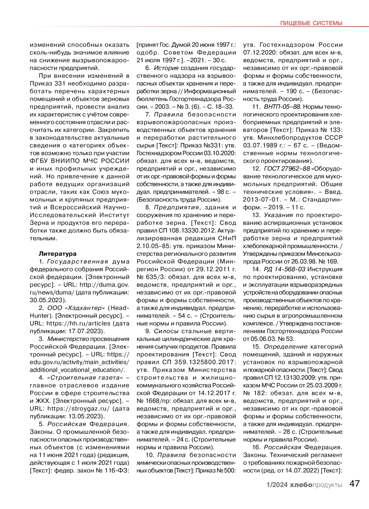 7. Правила безопасности взрывопожароопасных произ-водственных объектов хранения и переработки растительного сырья [Текст]: Приказ №331: утв. Гостехнадзором России 03.10.2020: обязат. для всех м - в, ведомств, предприятий и орг., независимо от их орг. правовой формы и формы собственности, а также для индиви -дуал. предпринимателей. - 98 с. -(Безопасность труда России).